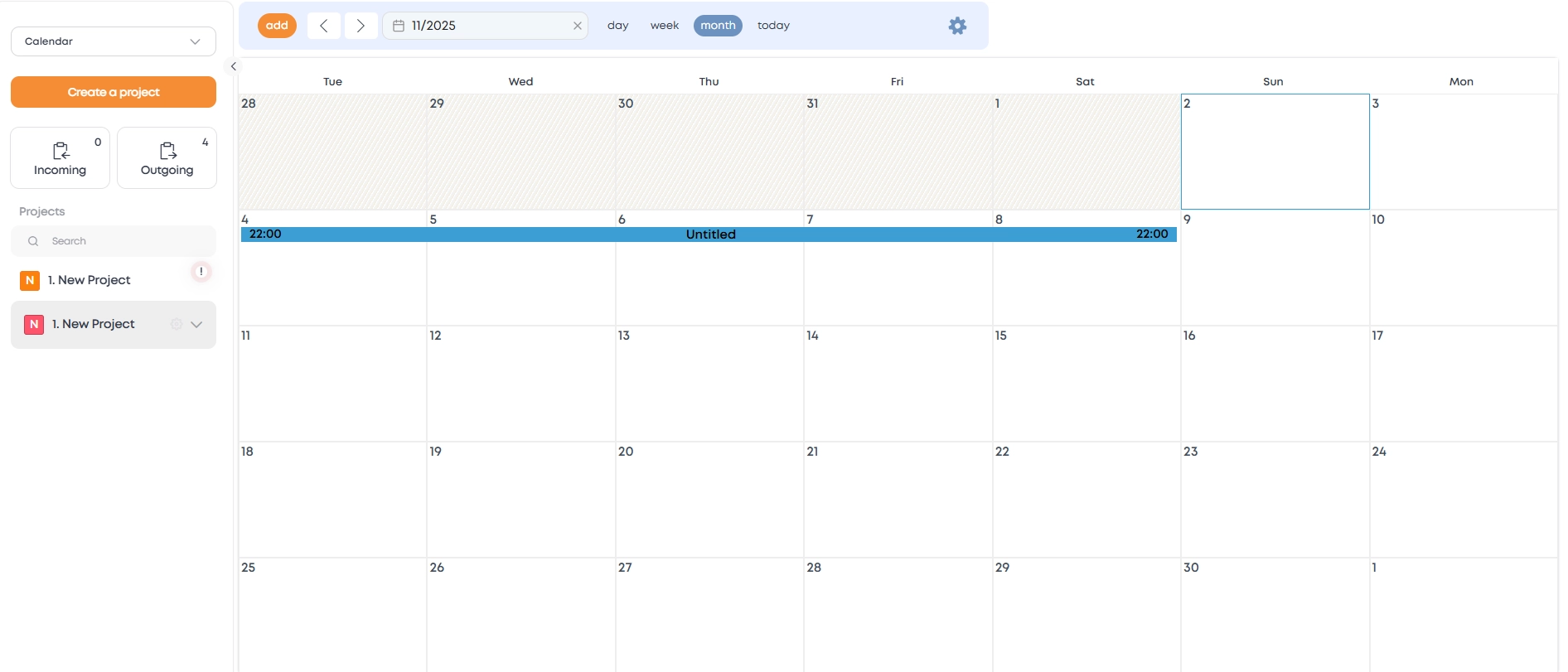 To see tasks of a specific project, click on its name in the list. Calendar will display all tasks of selected project with the set dates. Work features: Task name search is not available in calendar. To view tasks, you need to select specific projects in sidebar. Tasks without specified start and end dates are not displayed in calendar. All date changes in tasks are automatically synchronized between calendar and original projects. Important: Calendar is used to visualize tasks with set deadlines. To search and filter tasks by other parameters, use original Boards, Kanban, or Gantt services You can create tasks only by linking to a specific project. Calendar provides visual representation of schedule of tasks from all your workspaces, helping you effectively plan the time frame for work.